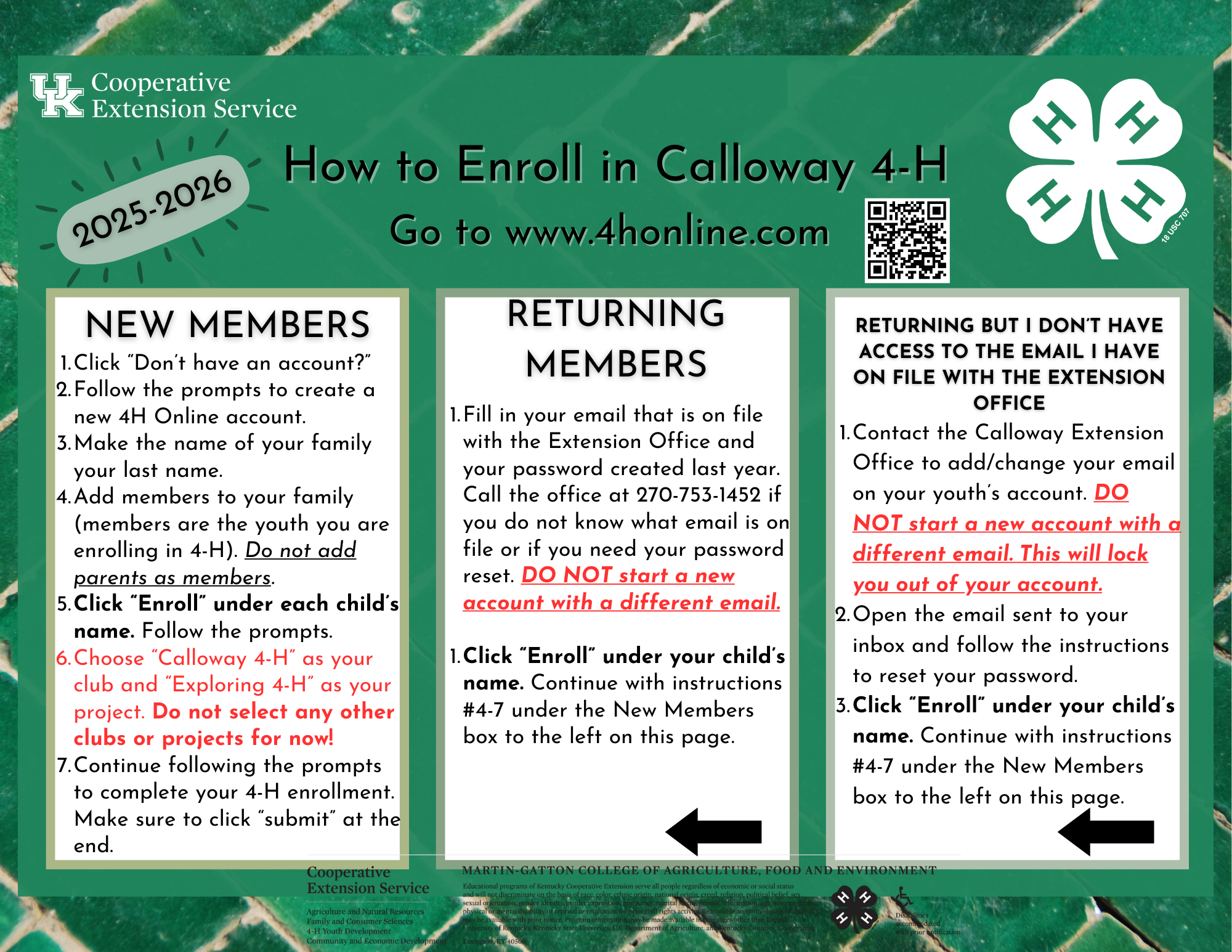 Click this link to enroll your youth in Calloway County 4-H. Follow the instructions to the left and call the Calloway County Extension Office at 270-753-1452 if you have any trouble!
